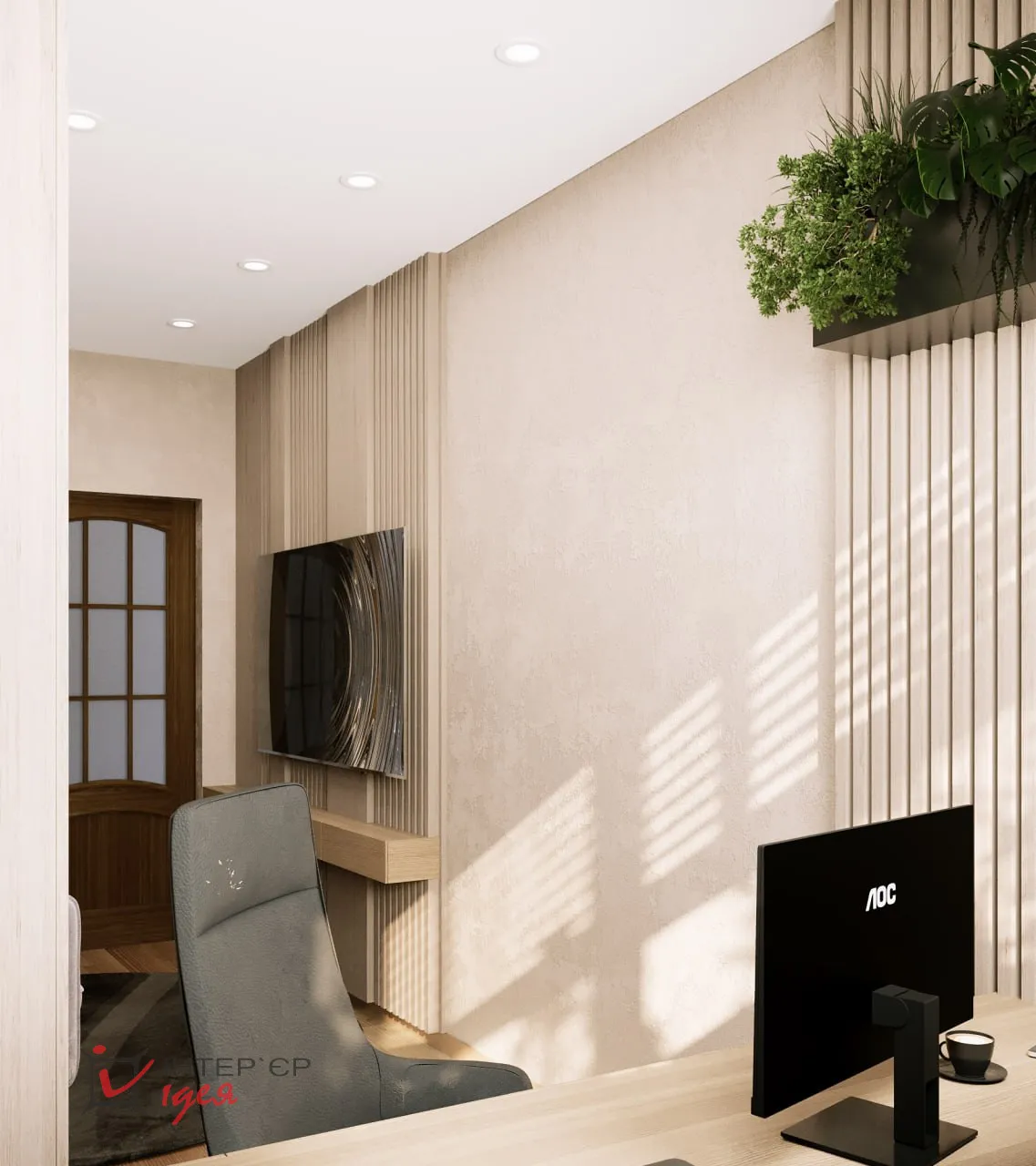 Материалы выбирались с учетом пожеланий заказчика и выбранного современного стиля рабочего кабинета, учитывались параметры комнаты.