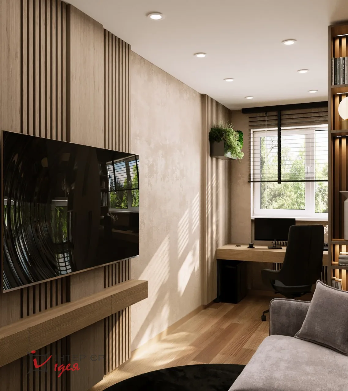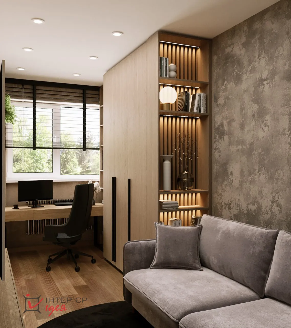 Дизайн домашнего офиса начинался с пожеланий владельца, с определения с узким многофункциональным направлением данной комнаты, и спецификой работы в ней.
