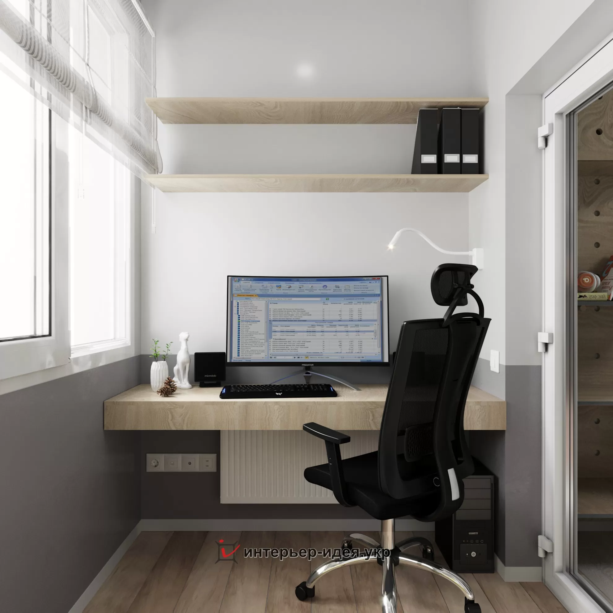 Зона лоджии, отведенная под рабочее место (по просьбе владельцев квартиры), что позволит им при необходимости работать удаленно.