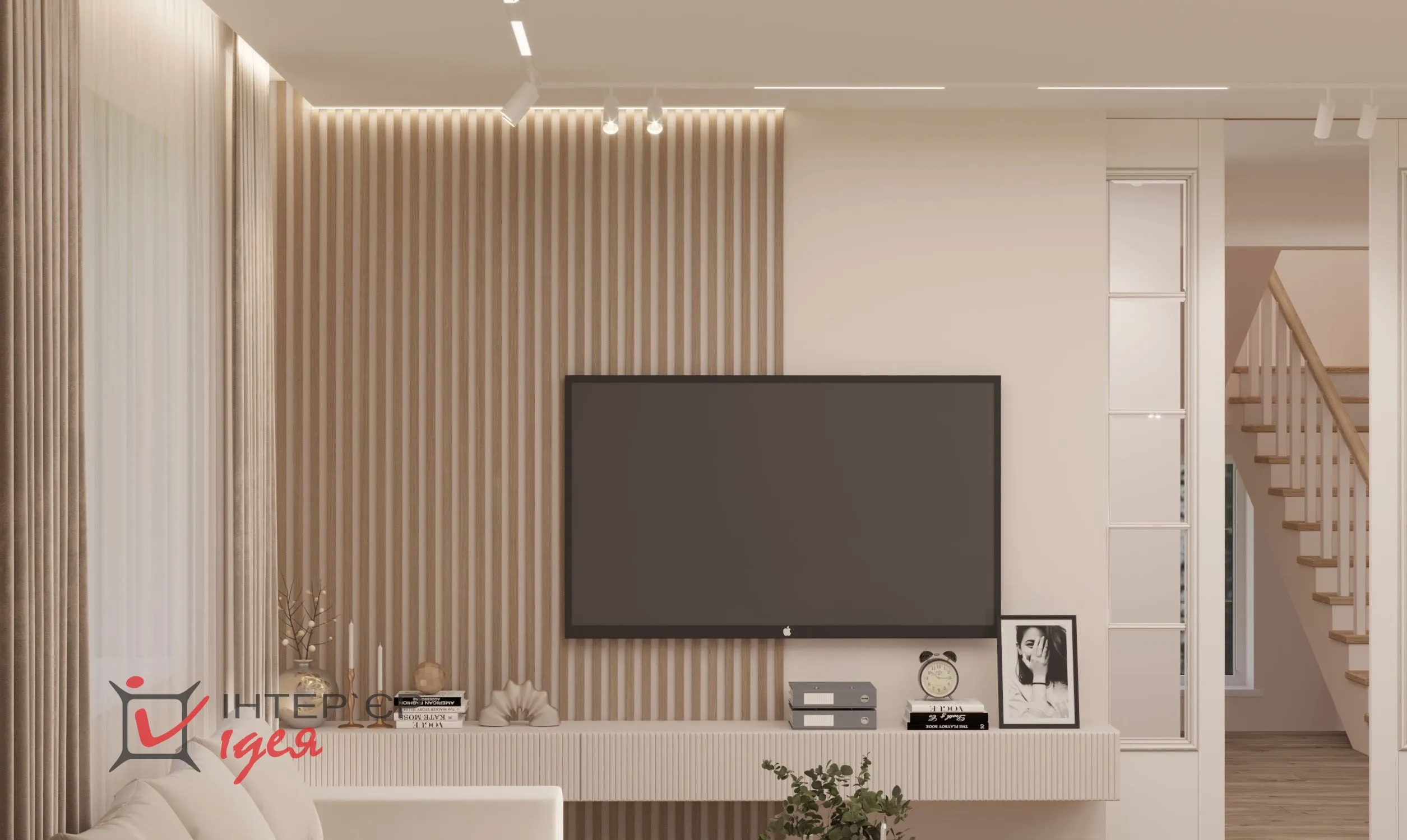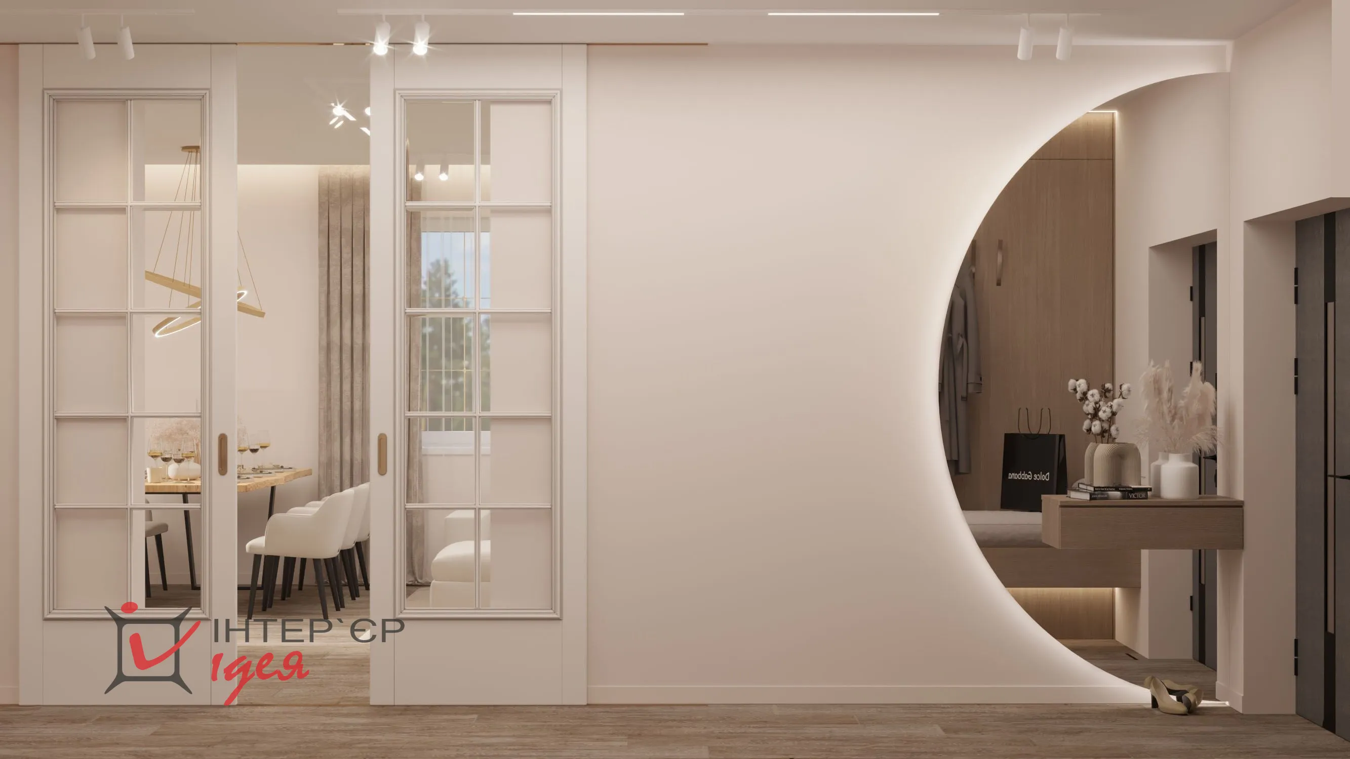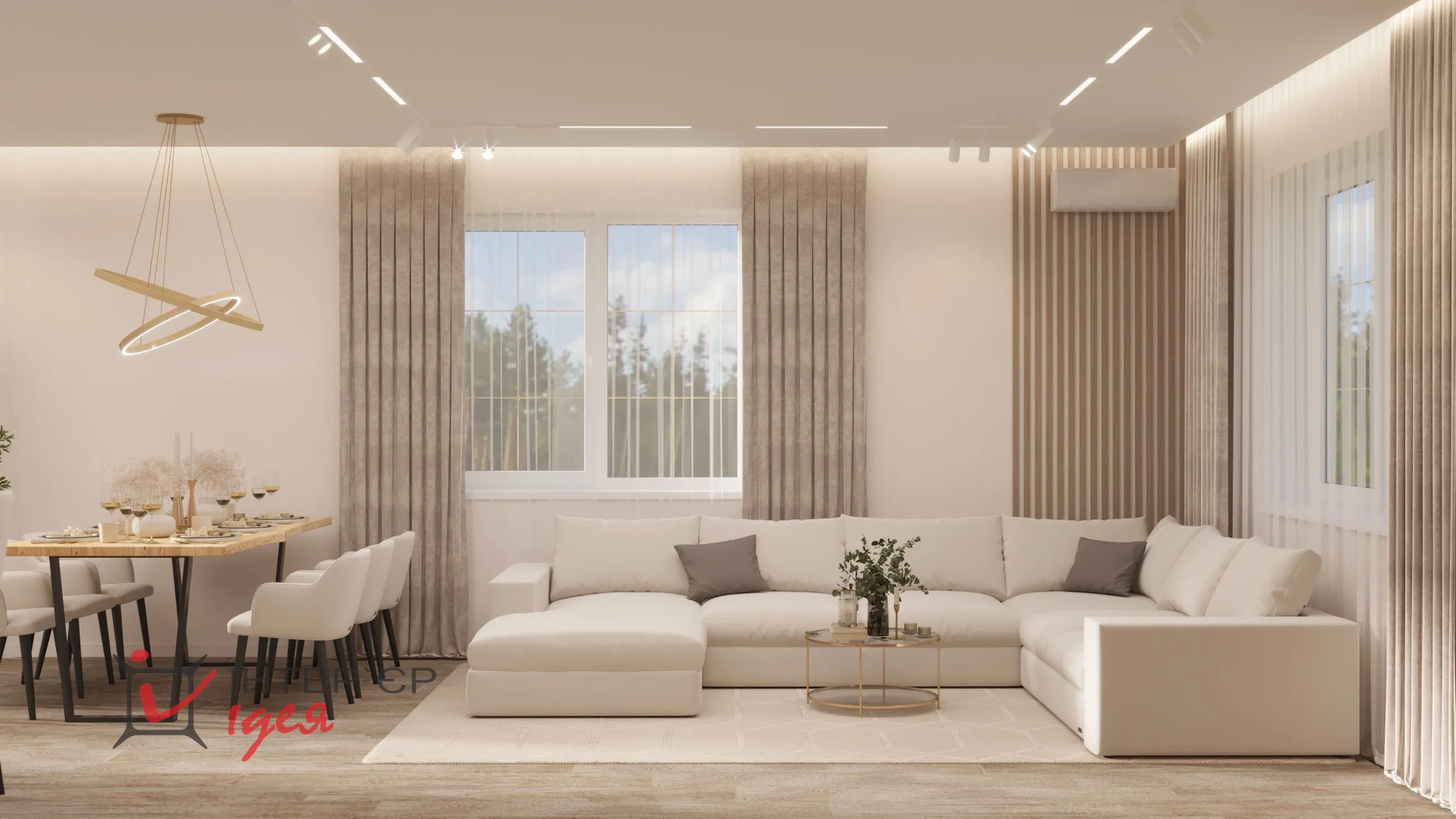 Светлые кремовые и деревянные оттенки гармонично сочетаются с мраморной текстурой на стене кухонной зоны. Барные стулья и стулья для обеденного стола имеют мягкую обивку, что придает комфорт. Элегантные люстры геометрической формы с мягкой подсветкой придают интерьеру изящество. Природные материалы, деревянные полы и декор в виде живых растений создают ощущение тепла и естественности.