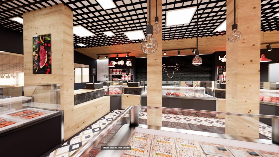 Основная задача: В данном проекте необходимо было разместить как можно большее количество холодильных витрин, а также предусмотреть места для стеллажей с дополнительным товаром (консервации, соусы, специи). Для каждого вида продукции предусмотрено отдельное место в торговом зале.